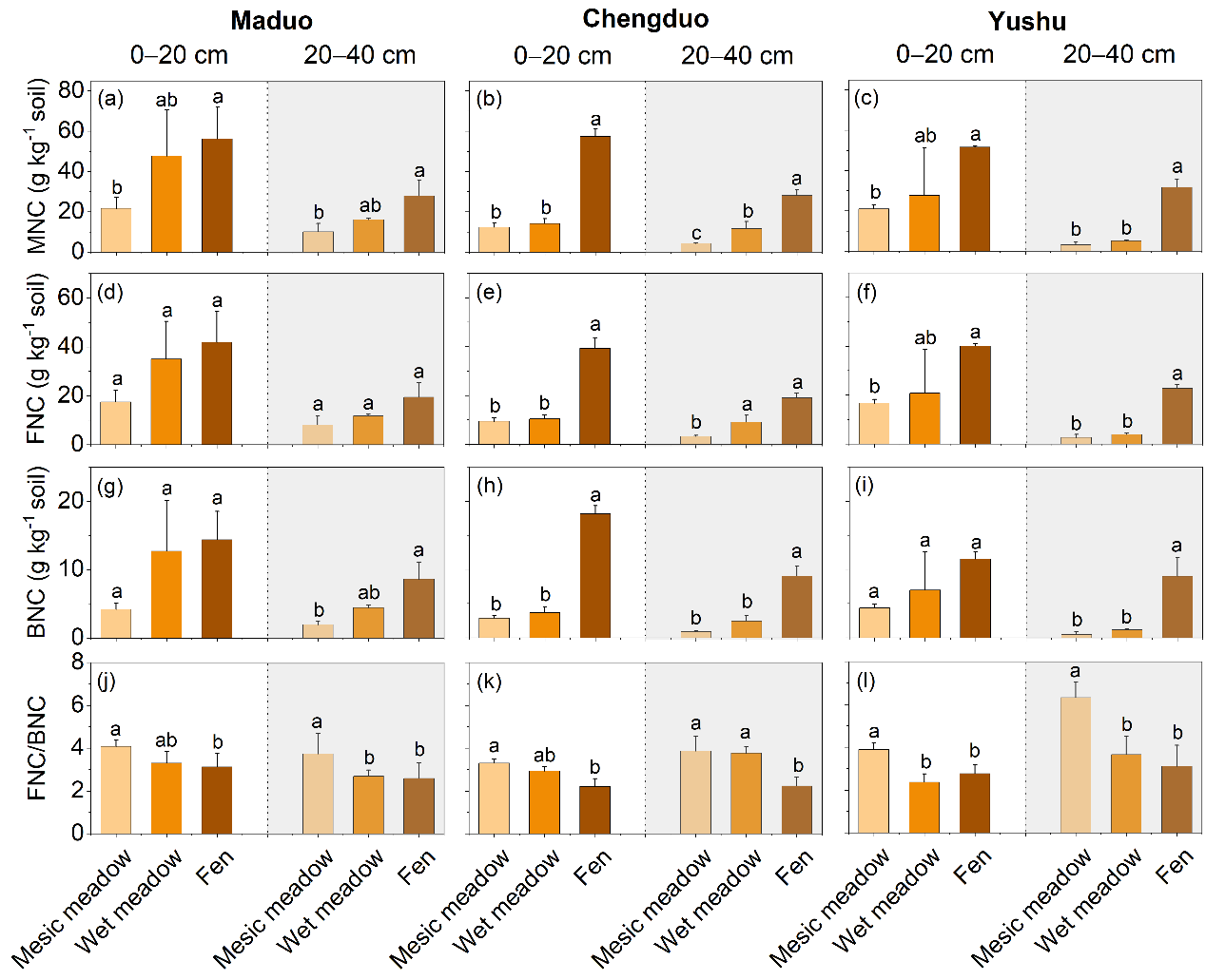 中國科學(xué)院西北生態(tài)環(huán)境資源研究院李玉強研究員團隊,在青藏高原沿高寒草甸-濕地連續(xù)體設(shè)置了27個采樣點,通過測定氨基糖等指標(biāo),系統(tǒng)揭示了水文變化對土壤微生物殘體碳和顆粒有機碳積累及其對土壤有機碳貢獻的影響。