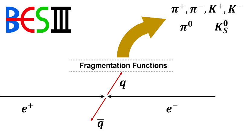 標(biāo)準(zhǔn)模型的量子色動力學(xué)(QCD)是描述部分子(夸克和膠子)間強(qiáng)相互作用的理論,它的最大挑戰(zhàn)來自于低能區(qū)的非微擾性質(zhì)。由于色禁閉效應(yīng),實(shí)驗(yàn)上無法直接觀測到帶色荷的部分子,只能探測色中性的強(qiáng)子。碎裂函數(shù)描述了部分子的強(qiáng)子化過程,對其研究是理解強(qiáng)子產(chǎn)生機(jī)制的重要手段。正負(fù)電子對撞中單舉強(qiáng)子的產(chǎn)生被認(rèn)為是研究碎裂函數(shù)最有效的過程之一(如圖1所示)。目前,在質(zhì)心能量低于10 GeV的區(qū)域,能用于碎裂函數(shù)研究的高精度正負(fù)電子對撞實(shí)驗(yàn)數(shù)據(jù)極為有限。
