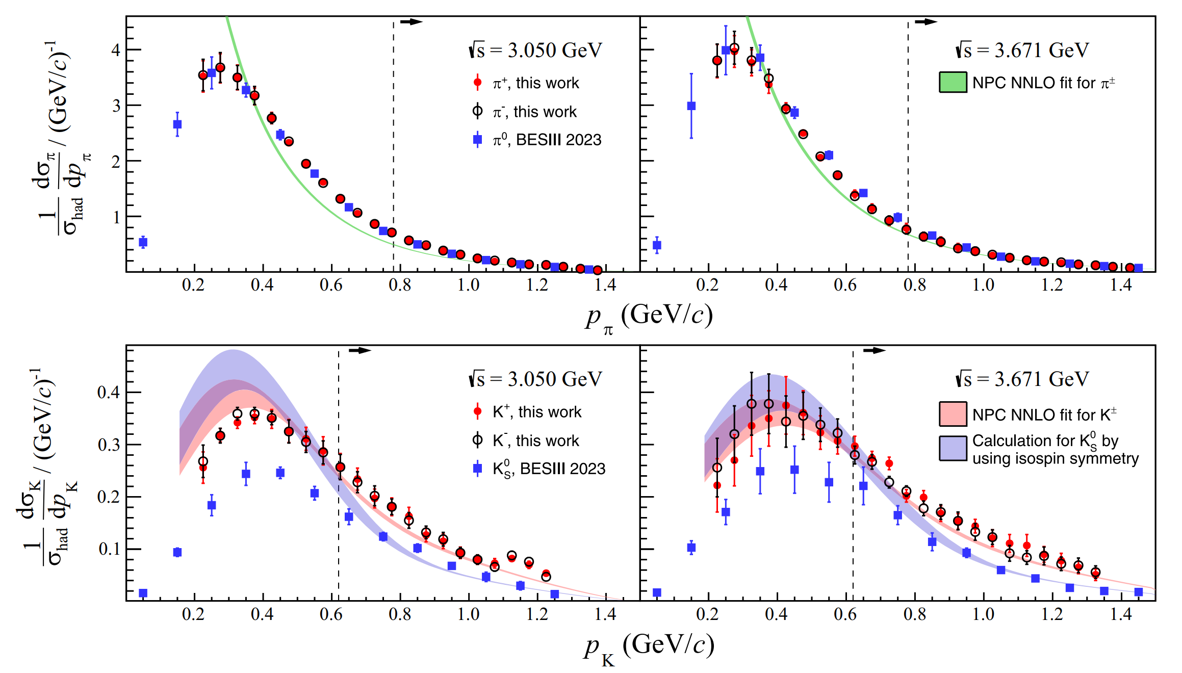 面對這一挑戰(zhàn),團(tuán)隊(duì)利用北京譜儀(BESIII)能量掃描數(shù)據(jù),精確測量了帶電pion和Kaon介子單舉產(chǎn)生微分截面,最高精度達(dá)1%~2%。結(jié)合NPC合作組(Non-perturbative Physics Collaboration)的全局?jǐn)?shù)據(jù)擬合研究,這一新的測量結(jié)果與基于次次領(lǐng)頭階(NNLO)精度的量子色動力學(xué)(QCD)理論分析相符合,尤其是大動量強(qiáng)子區(qū)域(如圖2所示)。該研究成果為檢驗(yàn)低能區(qū)QCD因子化定理及部分子碎裂過程中同位旋對稱性的有效性提供了有力的實(shí)驗(yàn)支持,對深入理解強(qiáng)相互作用動力學(xué)具有重要意義。